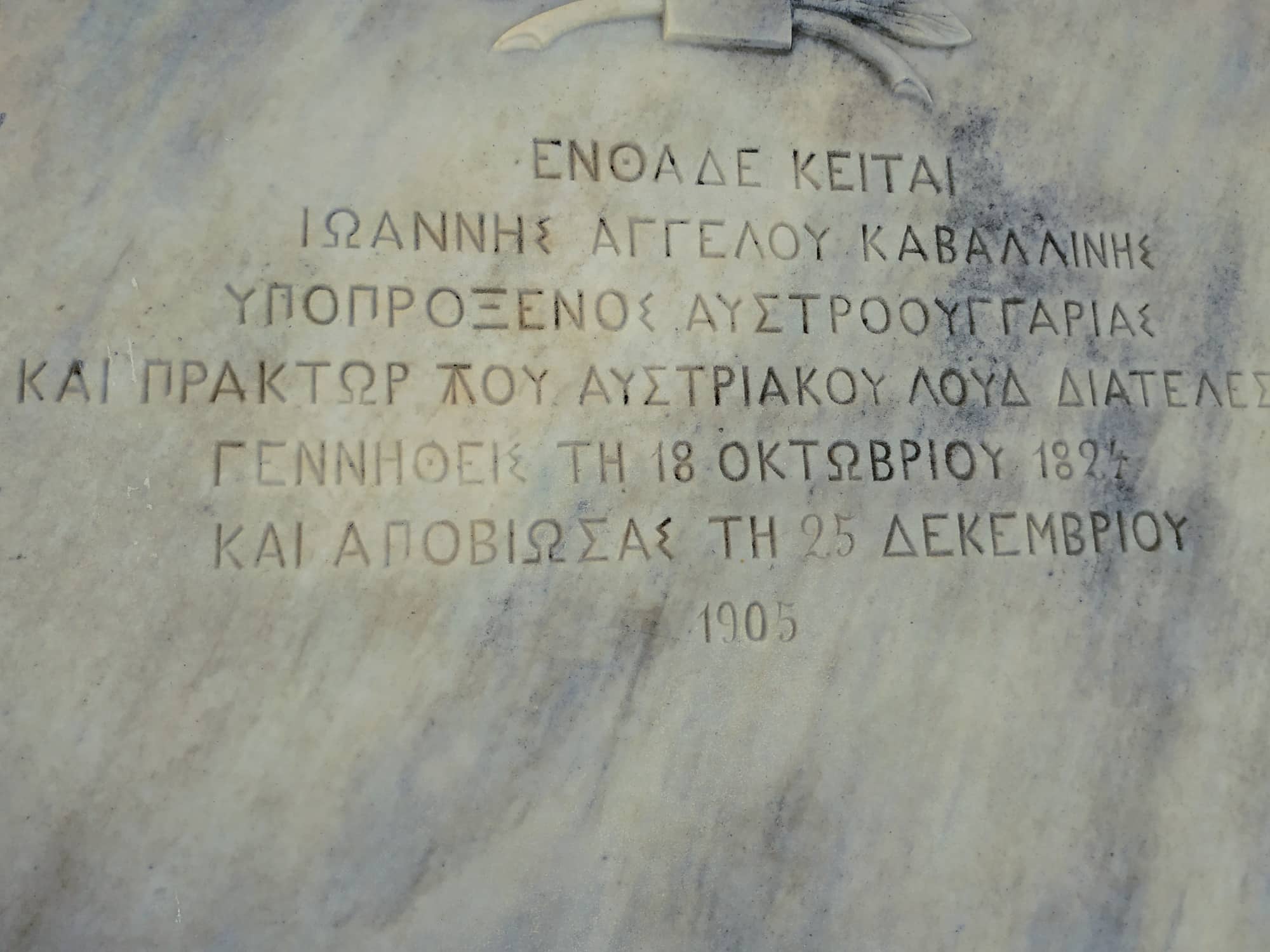 Είχαμε την τιμή να έχομε οικογενειακή σχέση και πολλές φορές βρέθηκα στο σπίτι του και κοίταζα με δέος αυτό τον ευγενή άνθρωπο σε μεγάλη ηλικία να κάθεται στην κουνιστή πολυθρόνα του. Πέθανε σε ηλικία 94 ετών το 1957. Την εξόδιο ακολουθία έψαλε ο ιερέας πατέρας μας, Σταύρος Χάρος και ενταφιάσθη στον οικογενειακό τάφο τους στο κοιμητήριο του αγίου Σπυρίδωνα στο Καψάλι, όπου είναι θαμμένοι και οι γονείς του Τζοβάννι Καβαλλινι και Ρόζα Κασιμάτη.
