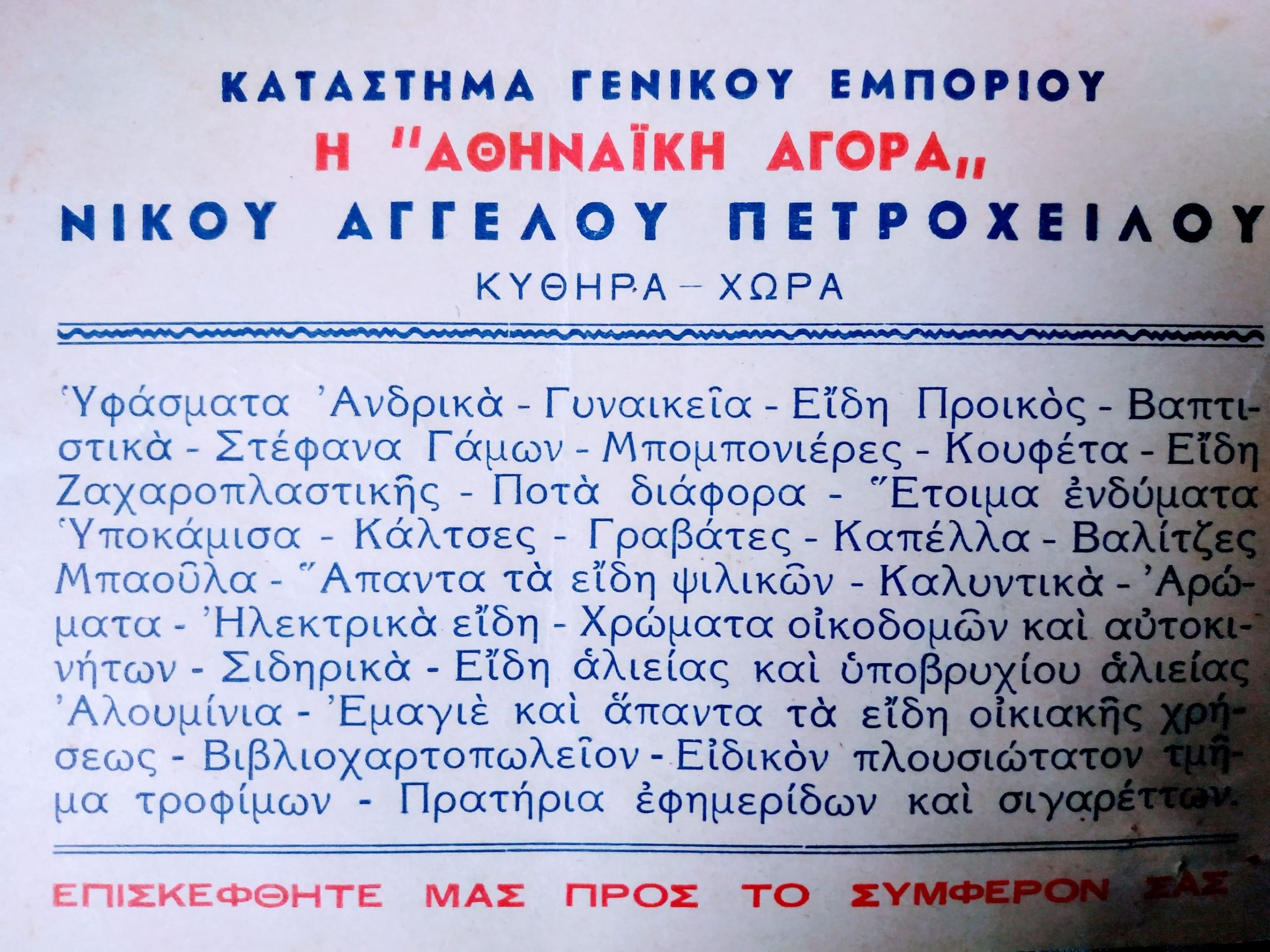 Το ιστορικό αυτό μαγαζί που λειτουργεί μέχρι σήμερα με άλλη δ/νση στην περιοχή του Μαρκάτου, ήταν για την εποχή του μια πρόγευση του super market. Εκεί εύρισκες τα πάντα. Από βαλίτζες μέχρι δραγάντε. Αριστερά μόλις έμπαινες στο μαγαζί ήταν οι δυό καρέκλες του κουρείου, διότι το κουρείο το διατήρησαν και το δούλευαν πατέρας και γιος.