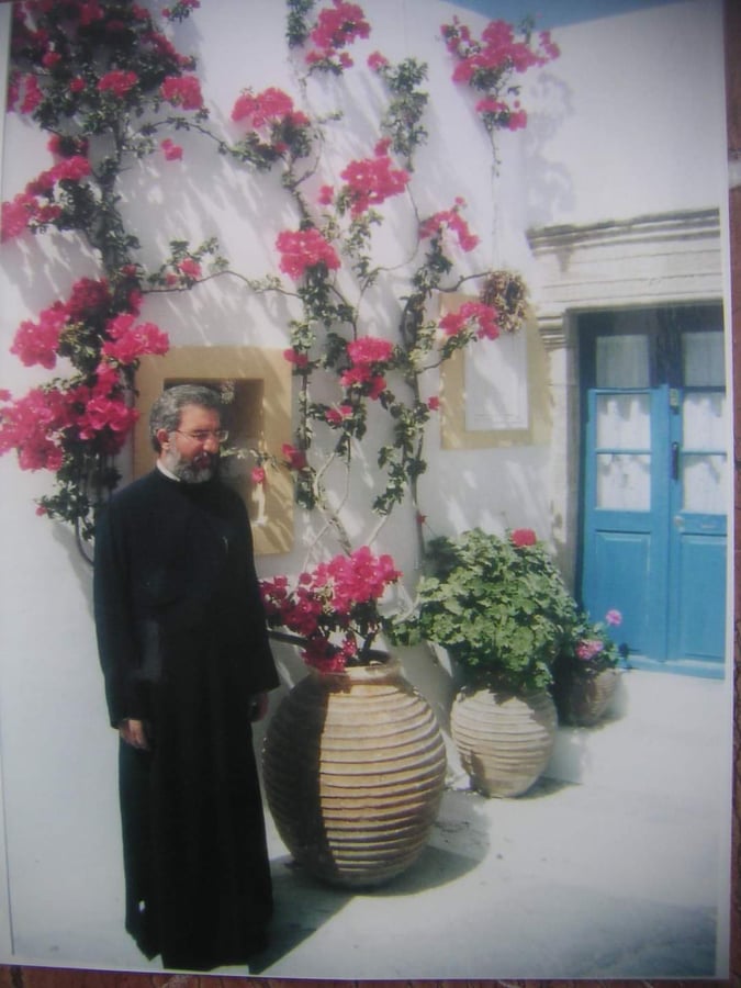 Όλα σε πλήρη αρμονία. Ο π. Φρουμέντιος, τα Κορωνέικα πιθαράκια με τη μποκαβίλια και τα γεράνια μπροστά στη πόρτα με το θαυμάσιο πώρινο περιθύρωμα.