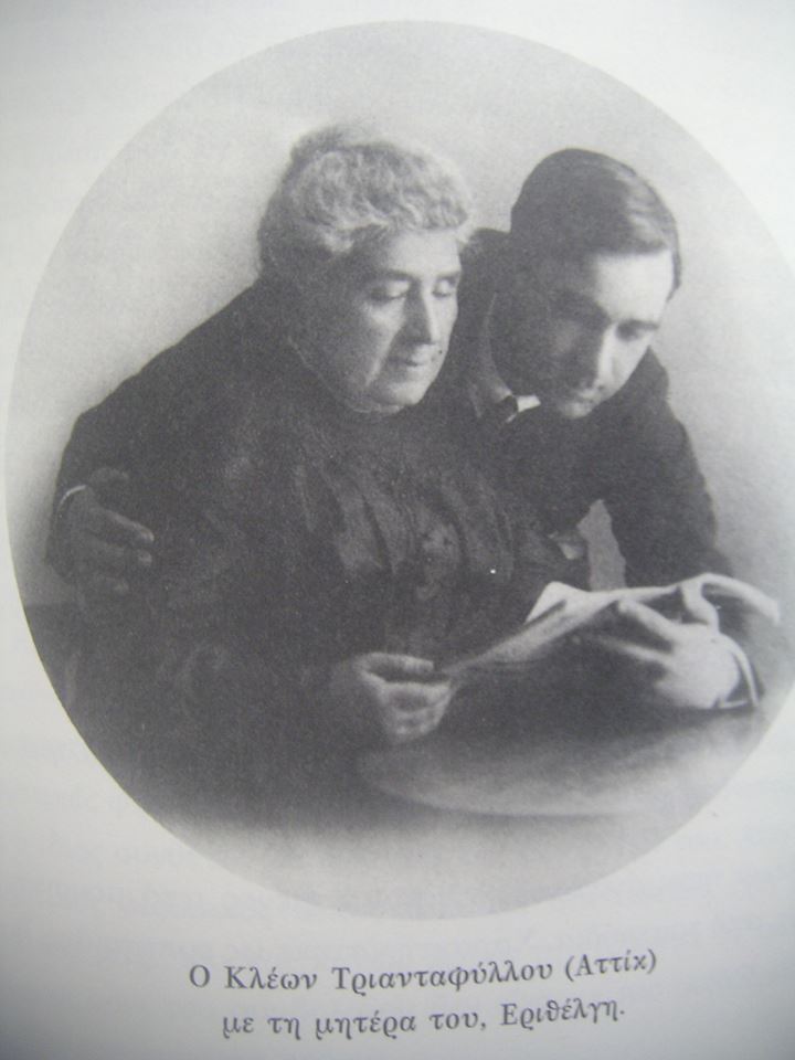 Ο Κλέων Τριανταφύλλου-Αττίκ με την προικισμένη Κυθηρία μητέρα του Εριθέλγη Ραπτάκη εις την οποία οφείλει την καλλιέργεια και τη μουσική παιδεία.
