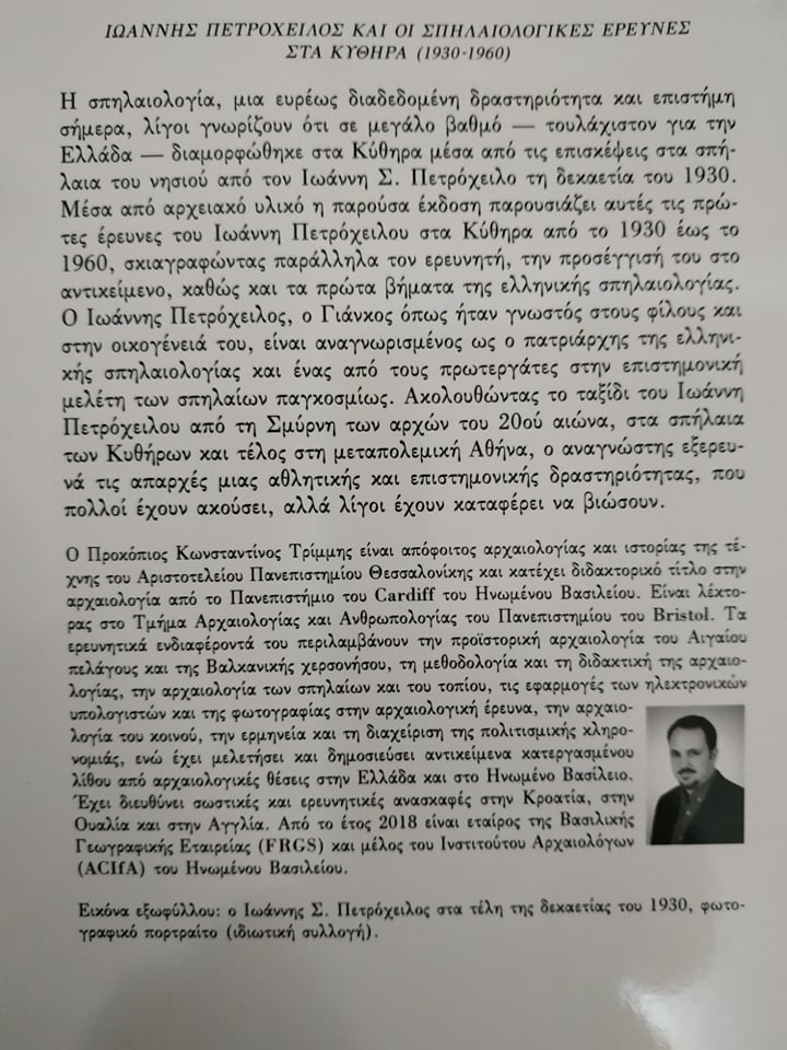 Η Κυθηραϊκή βιβλιοθήκη εμπλουτίστηκε με ένα ακόμη πολύτιμο εργαλείο, το οποίο φωτίζει το μαγικό κόσμο των σπηλαίων στα Κύθηρα, με τα οποία συνδέθηκε ο αξέχαστος Κυθήριος Γιάννης Πετρόχειλος.