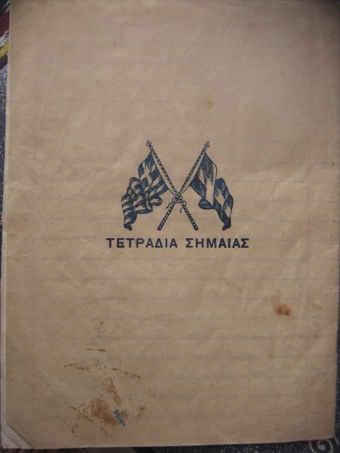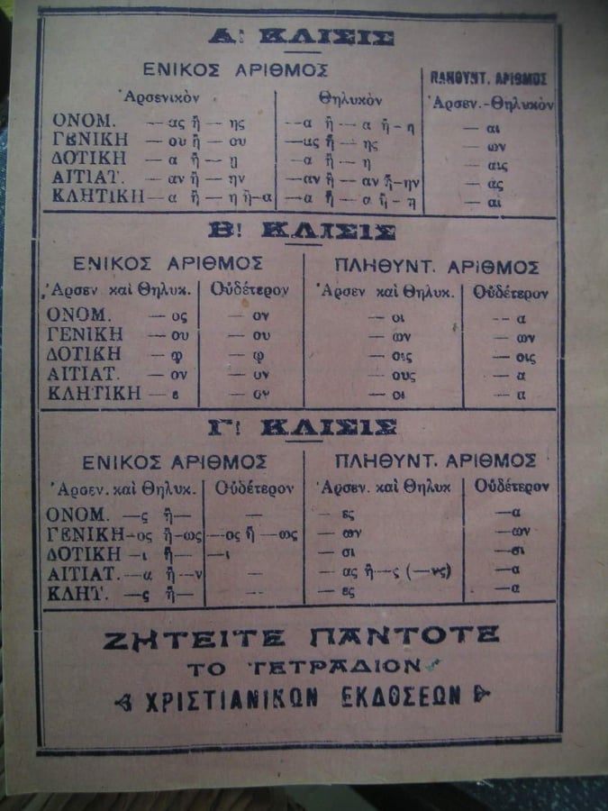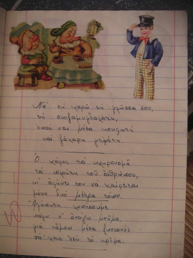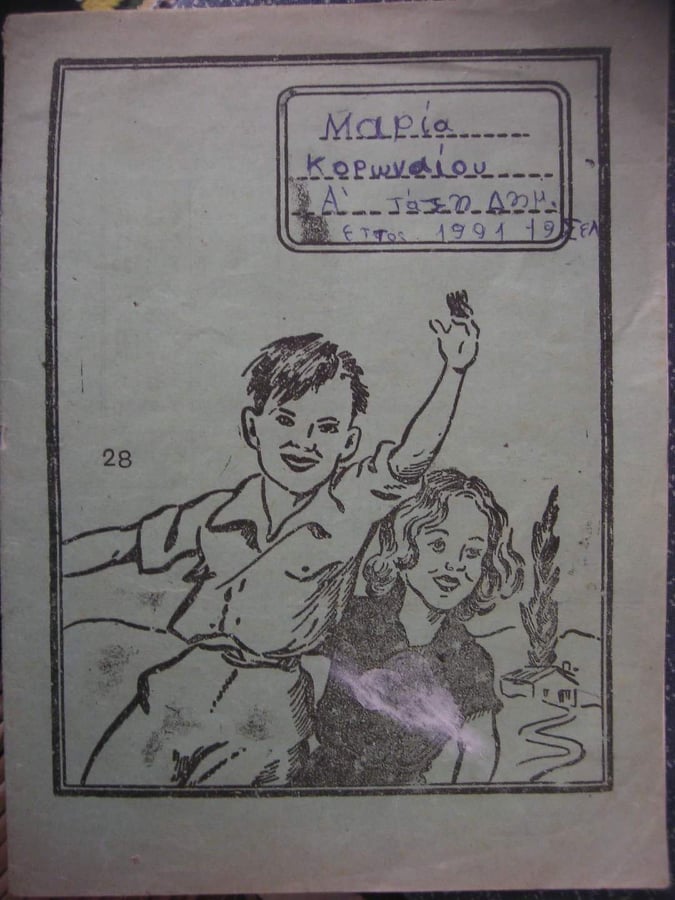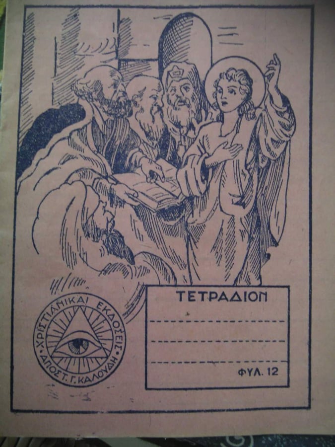 Στο οπισθόφυλλο ήταν η προπαίδεια, οι κλίσεις της γραμματικής, σημαιούλες κ.α. Ασπρόμαυρες, ή πολύχρωμες εικόνες με χαρακτήρα εκπαιδευτικό, χρωμολιθογραφίες και υδατογραφίες μας συνόδευαν στη διαδικασία της μάθησης. Κάποια από αυτά τα τετράδια έχουν χρησιμοποιηθεί για λευκώματα και τα στολίζαμε με καδράκια, μαντινάδες και ερωτήσεις χειρόγραφες του τύπου τι εστί φιλί, τι εστί αγάπη, τι εστί λεύκωμα, τι εστί αγάπη κ.τ.λ.