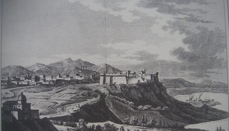 Το Κάστρο και η Χώρα από δυτικά. Γκραβούρα του 1800 από τον Andre Grasset Saint-Sauveur